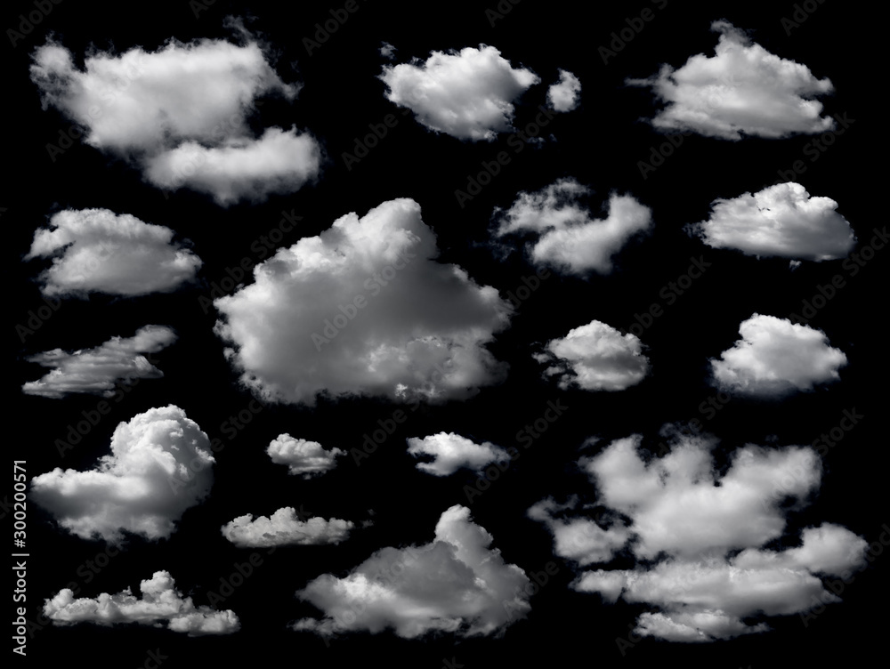 Clouds set isolated on black background. White cloudiness, mist or smog background.