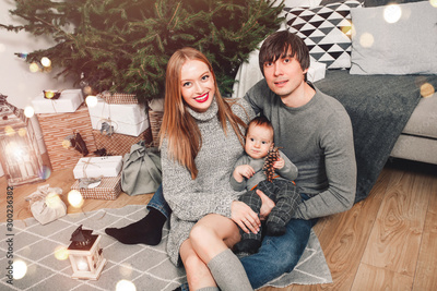 Christmas family with baby smiling near the Xmas tree. Living room decorated by Christmas tree and present gift boxes, the light give cozy atmosphere. New Year holidays