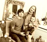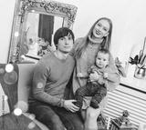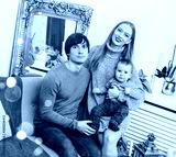 Christmas family with baby smiling in living room decorated by xmas tree and present gift boxes. Merry Christmas and New Year holidays