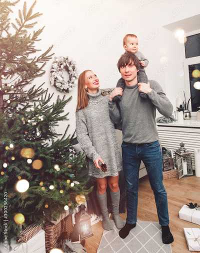 Christmas family with baby smiling near the Xmas tree. Living room decorated by Christmas tree and present gift boxes, the light give cozy atmosphere. New Year holidays