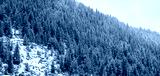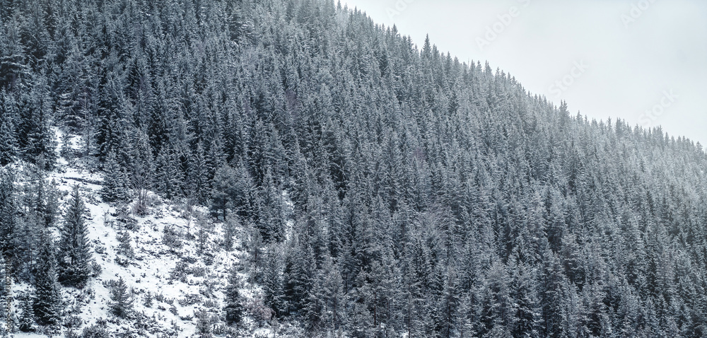 Winter mountains with white snowy spruces. Wonderful wintry landscape. Amazing view on snowcovered forested mountain slope. Tourism concept. Happy New Year