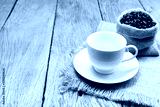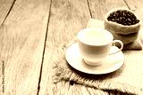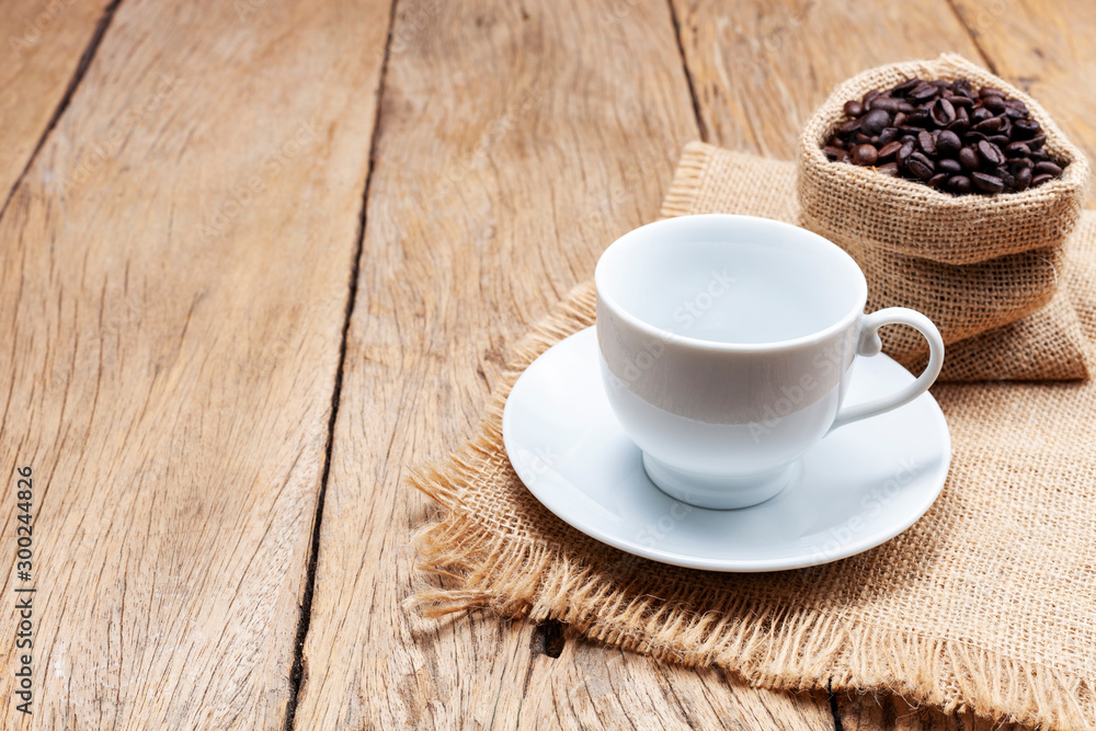 Empty white coffee cup with coffee beans on wooden plank floor background