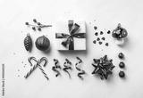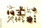 Christmas decoration, gift boxes with red ribbon, sparkles, confetti, christmas candy and balls on white background. Xmas and Happy New Year holiday. Flat lay, top view