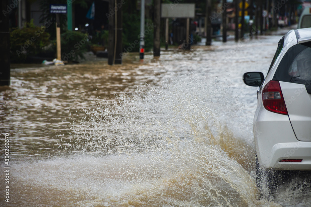 Car driving on flooded road with Flood water flow through the road after heavy winds and storm surges.