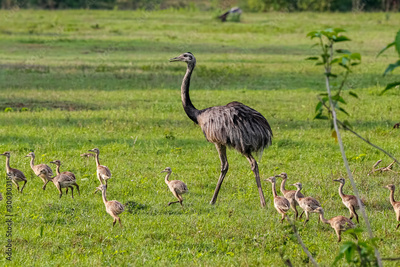 Rhea or Nandu mother and babies foraging in grass, Pantanal Wetlands, Mato Grosso, Brazil