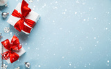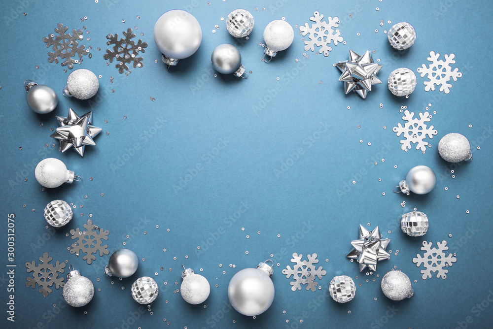 Merry Christmas and Happy Holidays greeting card, frame, banner. New Year. Noel. Christmas white and red ornaments and gifts on blue background top view. Winter xmas holiday theme. Flat lay.