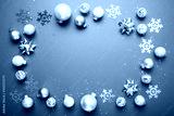 Merry Christmas and Happy Holidays greeting card, frame, banner. New Year. Noel. Christmas white, silver .ornaments on blue background top view. Winter xmas holiday theme. Flat lay