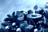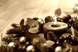 Christmas candle with fir branches and eucalyptus leaves on rustic wooden background - Advent time