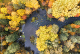 Top down drone shoot over colourful trees and curving river at warm autumnal day.