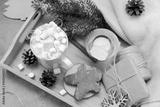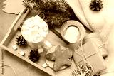 hot chocolate with marshmallows and cinnamon, spruce branch, cookies, cones, gingerbread man, candle, snowflakes, gift, box, top view