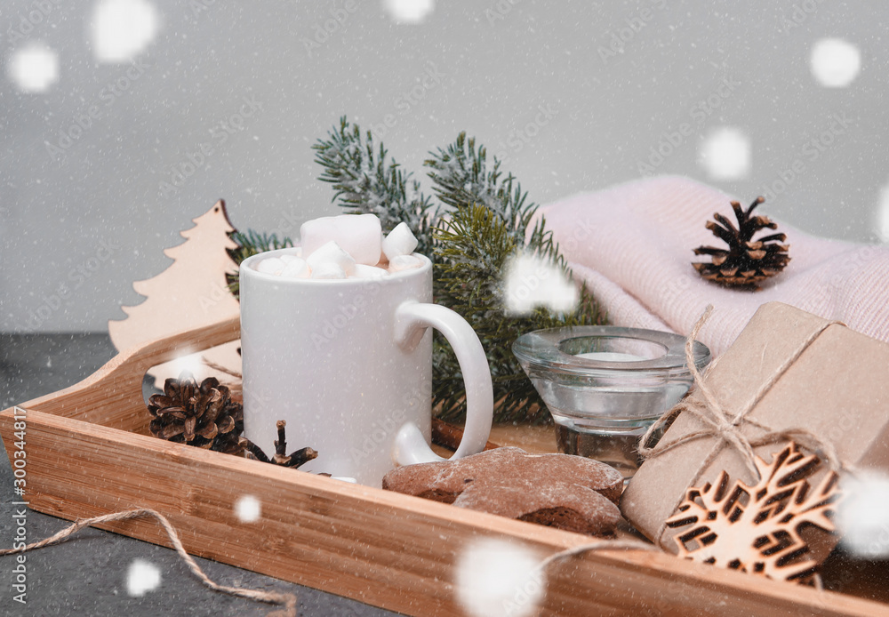 cocoa, hot chocolate with marshmallows , spruce branch, cookies, cones, gingerbread man, candle, snowflakes