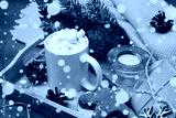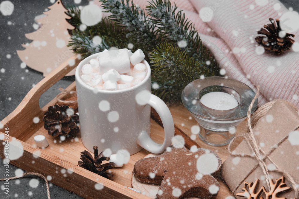 cocoa, hot chocolate with marshmallows , spruce branch, cookies, gingerbread man, snow, snowflakes,