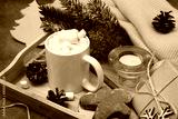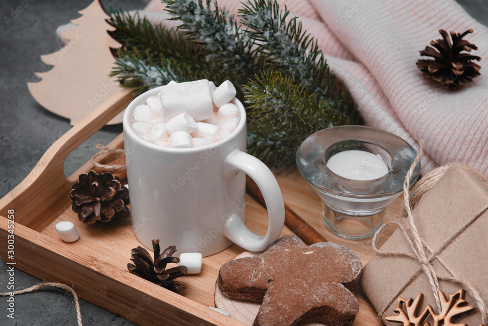 cocoa, hot chocolate with marshmallows and cinnamon, spruce branch, cookies, gingerbread man, candle