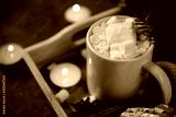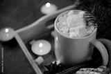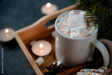 1 Cup hot chocolate cocoa with marshmallows, fir branch, candles on dark