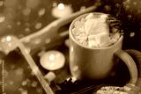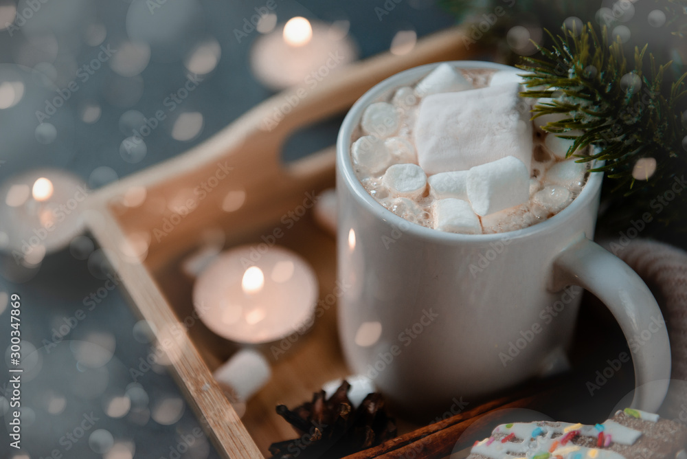 Cup hot chocolate cocoa with marshmallows, spruce branch, candles on a gray background, bokeh, spots,