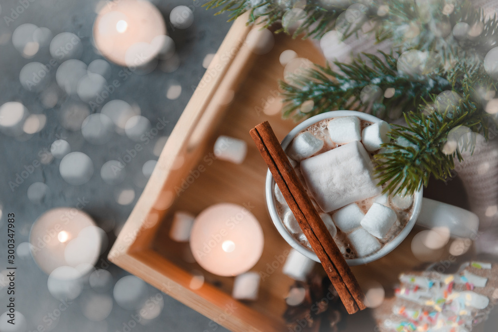 hot chocolate with cinnamon and marshmallows, cookies, spruce branch, candles with lights and bokeh on a gray background, top view