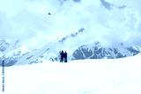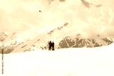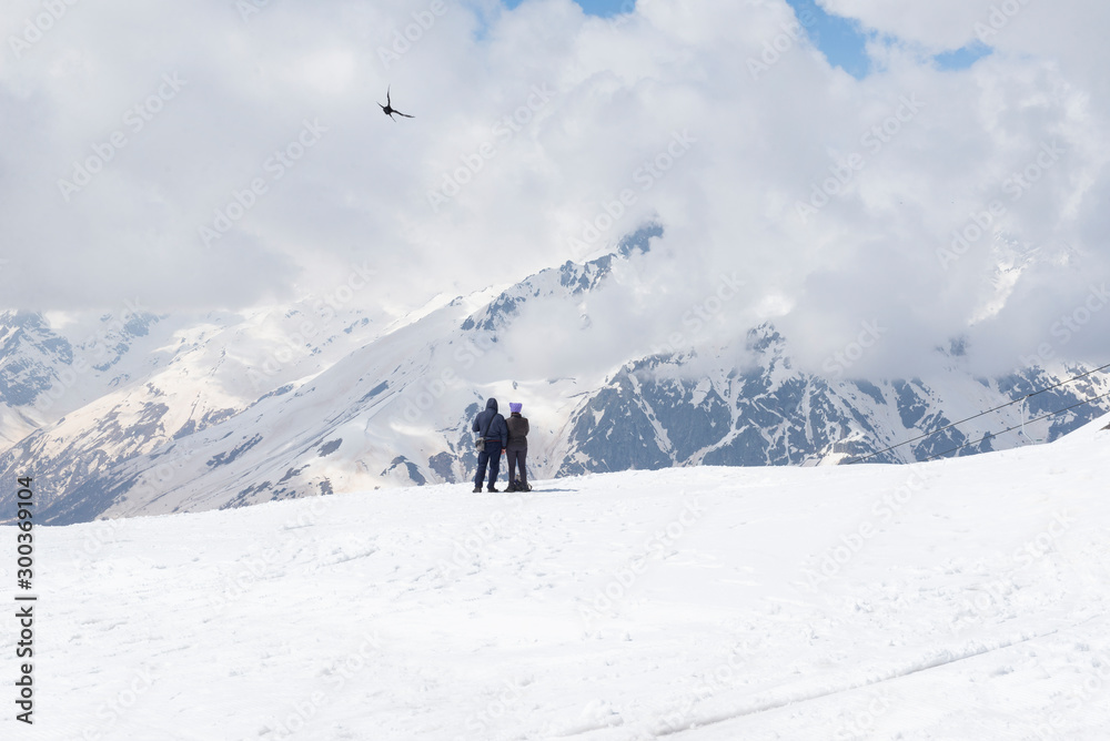 people and bird in the mountains of the North Caucasus in winter, snow,