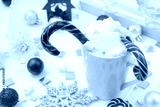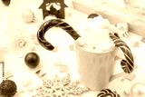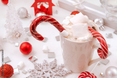 Cup hot chocolate, cocoa with marshmallows and lollipops, red and silver balls, candle, snowflake, transparent Christmas tree, Christmas decor