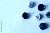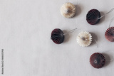 Christmas styled stock composition. Decorative white and crimson paper Christmas ornaments on grey table linen background. Flat lay, top view. Winter festive pattern, empty copy space.