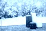 Beautiful Christmas red and white candles lie on the wooden table over snow covered forest background. Atmosphere of magic and fairy tales