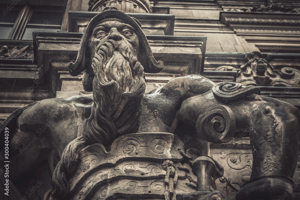 Close-up view of the statue of scary gatekeeper, medieval warrior with weapon. City gate under the Georgenbau in Dresden old town. Germany. Old photo effect.