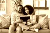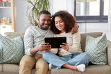 technology, internet and people concept - happy african american couple with tablet computer at home