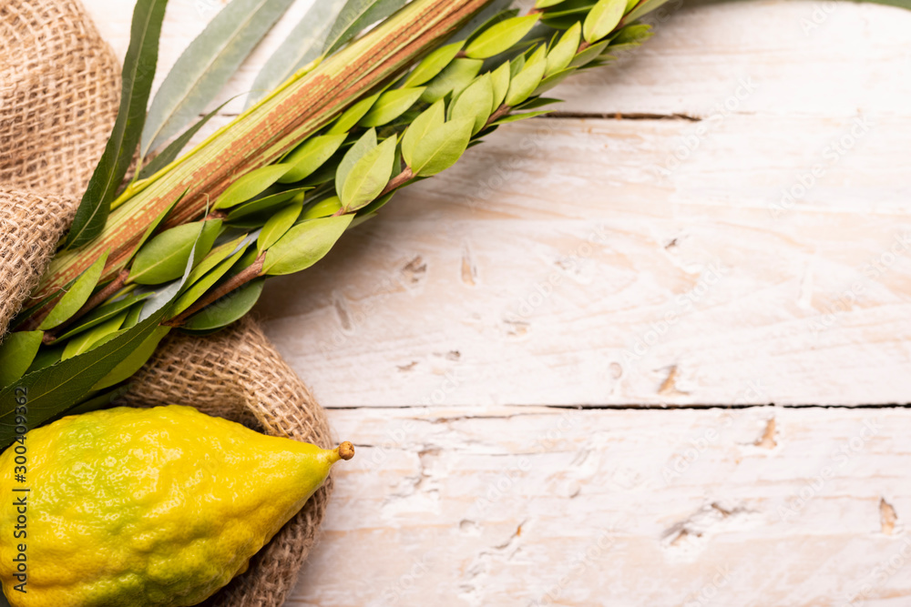 Composition of Sukkot symbols: palm, willow, myrtle, etrog. Lulav on jute fabric and wood background with a copy space.