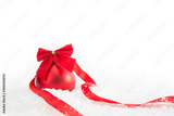 Red christmas ball with ribbon on white background.