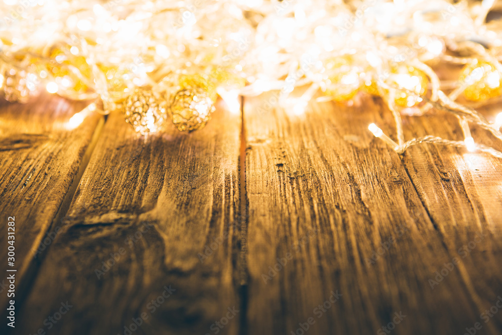 Christmas fairy lights on a wooden table