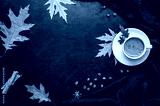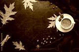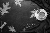Autumn flat lay. Cup of coffee, brown pashmina scarf, autumn leaves, cinnamon sticks and coffee beans on black background. Top view. Copy space
