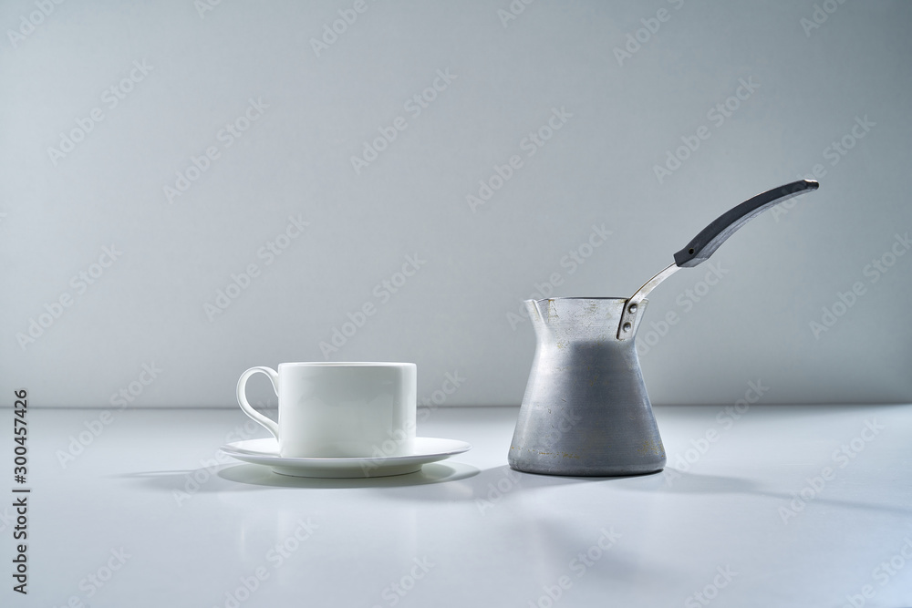 Composition with white porcelain tea-ware on a light gray background with a delicate bouquet of flowers