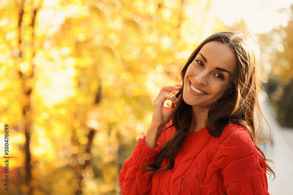 Beautiful woman wearing red sweater in sunny park. Autumn walk