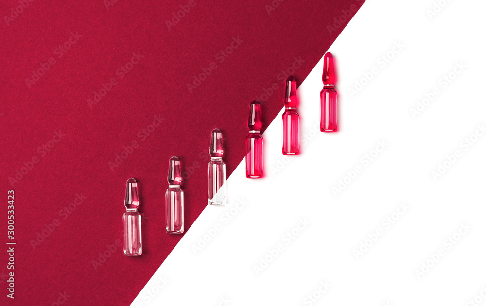 Diagonal line of ampules for injections with red and transparent liquid on isolated white and dark red background. Medicine, healthcare and pharmacy concept. Flat lay.