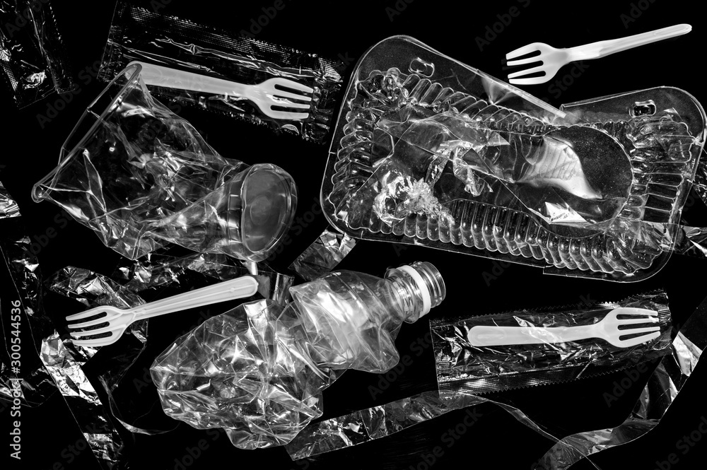 Various disposable crumpled plastic garbage isolated on a black background. Concept of recycling plastic and ecology.