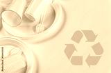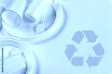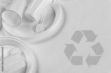 Disposable plastic tableware and recycling sign on a light background in pastel colors. Minimalistic ecologically clean still life. Pop Art. And ecology problem concept.
