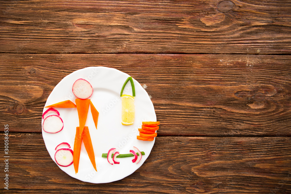 Healthy lifestyle concept - vegetable athlete on dish on wooden