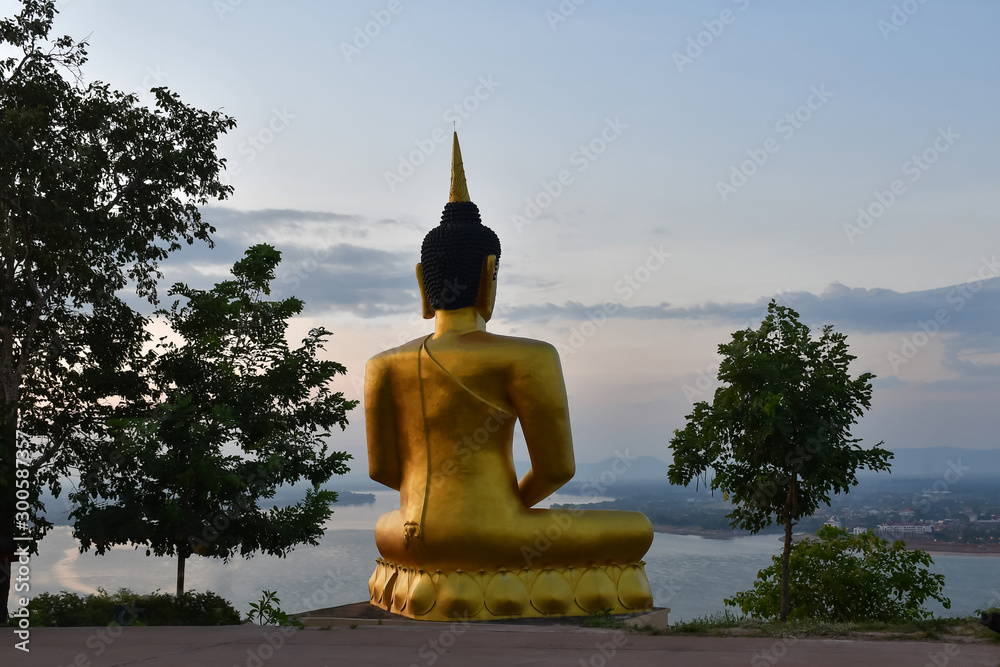The big golden Buddha statue of Phu Salao temple in beautiful sunset moment at Pakse, Laos