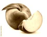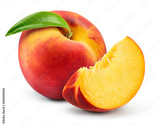 Peach isolate. Peach slice. Peach with leaf on white background. Full depth of field. With clipping path.