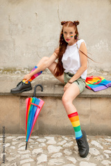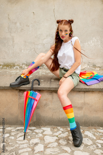 Fashionable lgbt girl in colorful socks wearing male boots. Stylish lesbian with lgbt rainbow on her face posing outdoor