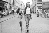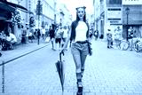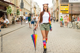 Lifestyle portrait of lesbian with lgbt flag on her face posing on the street