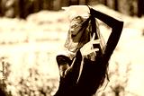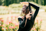 Young beautiful girl in black old fashioned dress with veil posing in park