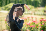 Young beautiful girl in black old fashioned dress with veil posing in park