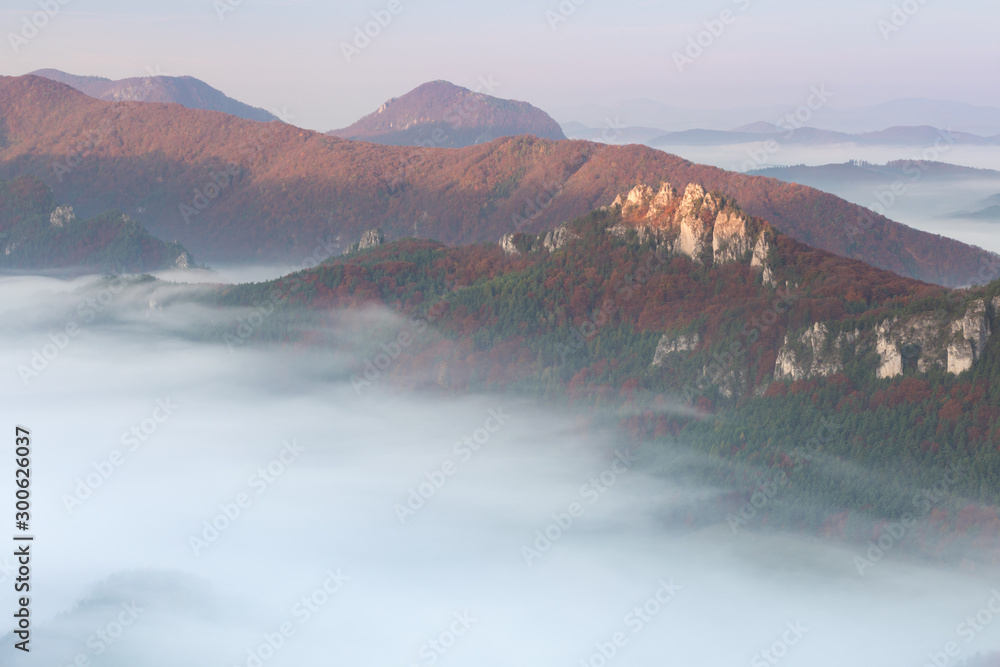 Autumn mountain forest rocks view. Mountain rocks in autumn forest. Autumn forest trees in rocks. Mountain forest in autumn landscape. Explore the beauty of world Colorful landscape background concept