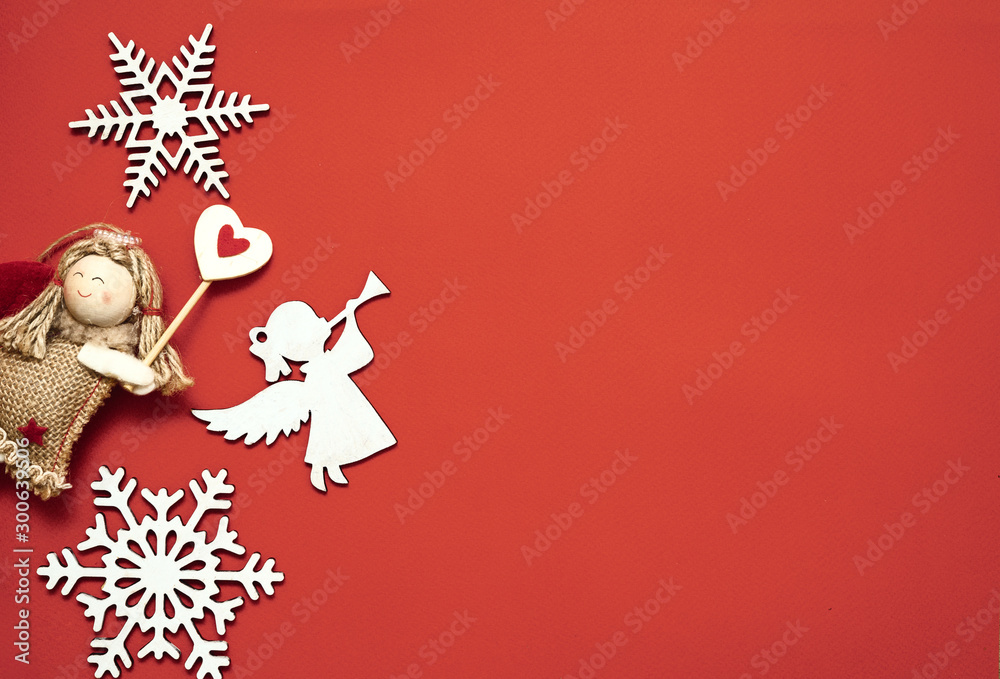 Flat lay on red background. wooden snowflakes and angel. Hand made decoration. 2020 new year
