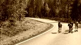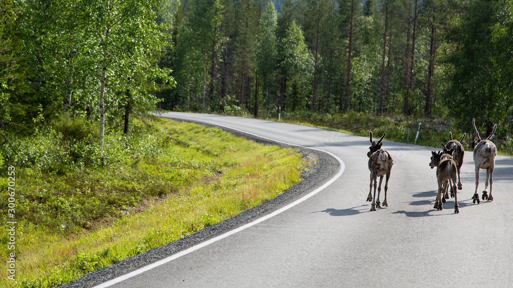 Group of reindeers crossing a county highway road. Car and wild animal accident concept.