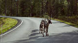 Reindeers walking on the county highway. Car and wild animal accident concept.