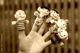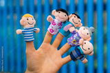 family finger puppet theater. child hand with finger puppets: son, daughter,mum, dad, granny, granddad. Kid playing fingers puppets. Family and generation concept.