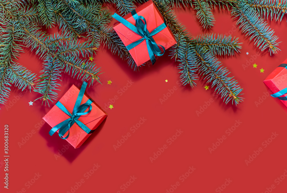 Image of beautiful red gift boxes and spruce branches on a red background.