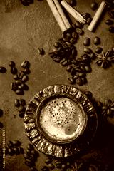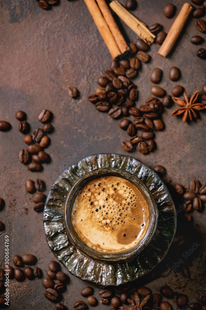 Black coffee espresso with foam in black ceramic cup, with saucer, spices and roasted beans above over brown texture background. Flat lay, space