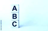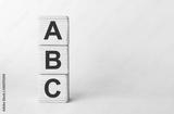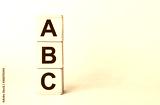 ABC letters of wooden blocks in pillar form on white background, copy space